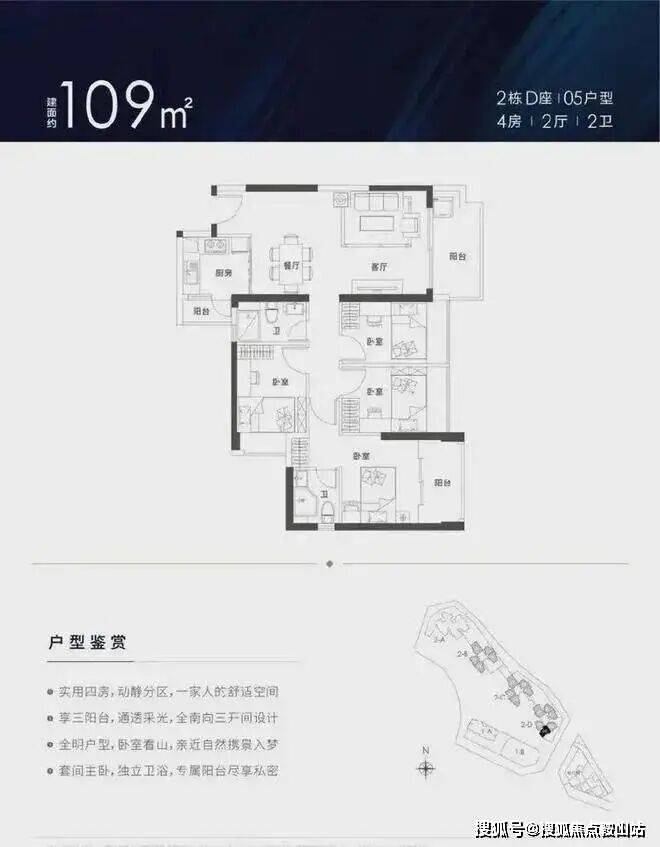 109㎡的4房2厅2卫,设计的竖厅格局,客厅主卧双阳台设计,厨房也带小阳台,四开间朝南,客厅朝东南向。