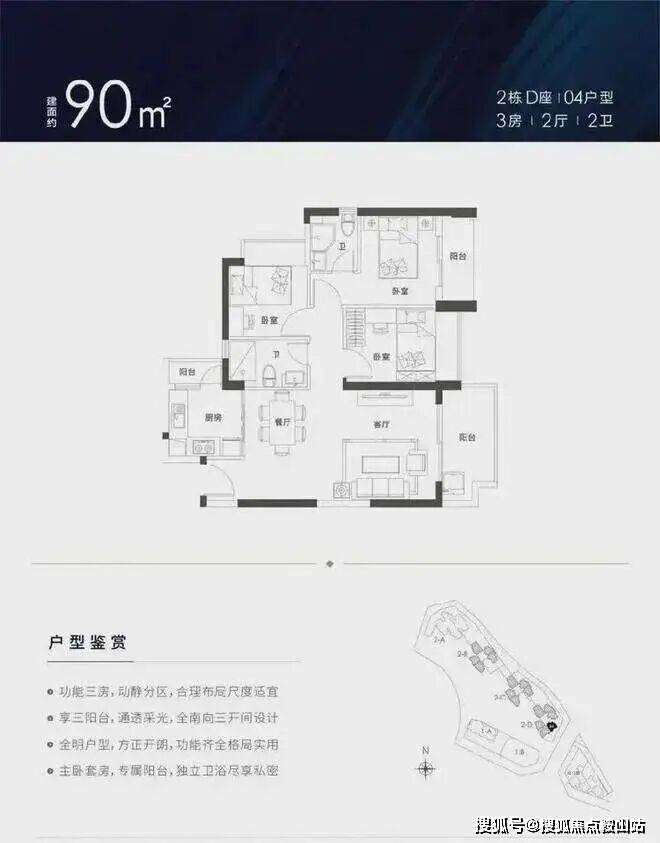 90㎡的3房2厅2卫,设计的竖厅格局,客厅主卧双阳台设计,厨房也带小阳台,三开间朝南,客厅朝东南向。