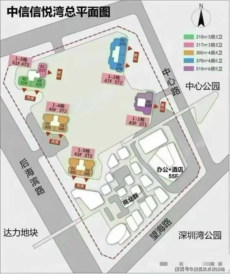 中信信悦湾原为佳兆业所有,2022年6月,被中信城开以300亿元接盘。项目坐落于南山区后海大道与望海路交界东北角,总建筑面积约31.8万㎡,容积率4.92,规划5栋超高层住宅,限高200米,最高楼层达47层。