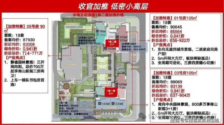 此次加推共54套户型为90-105㎡3房,备案均价8.87万带精装,开盘约0.941折,折后均价8.35万,总价714万起。