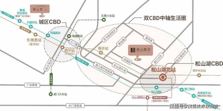 项目(直线)约1.2公里松山湖北站CBD,华为、大疆、易事特等大批高净值高企进驻,比肩深圳前海发展。
