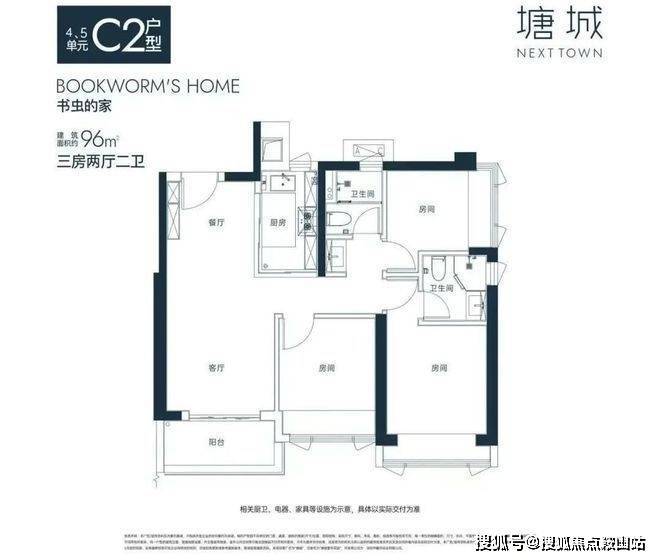 96㎡的3房2厅2卫,C1户型,5栋1单元06/07户型,设计的是竖厅格局,进门入户玄关,客厅3.3米开间,得房率约80%(包含赠送),东北或西南朝向。