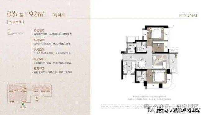 92m²的3房2厅2卫,双龙抱珠格局,客厅3.2米开间,LDKB一体化宽厅,主卧套房270°环幕凸窗,七大凸窗+设备平台,U型厨房,卫生间干湿分离。阳台正东朝向,得房率76%(不含赠送,套内面积69.86㎡)。