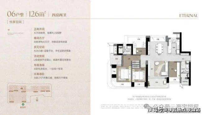 126m²的4房2厅2卫,竖厅南北通透格局,客厅3.9米开间,客餐厅分离化设计,五开间朝南,主卧套房270°环幕凸窗+私享阳台,七大凸窗+设备平台U型厨房,卫生间干湿分离。阳台正南朝向看皇岗公园,得房率75.9%(不含赠送,套内面积95.64㎡)。