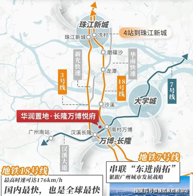 交通配套项目的轨道交通非常发达,下楼约250米就是3号线和7号线交汇站点(汉溪长隆站),也是广东城际的换乘站。1站到南村万博站,就能换乘18号线,往南走直达南沙,中山,珠海,往北走直达珠江新城,白云机场。