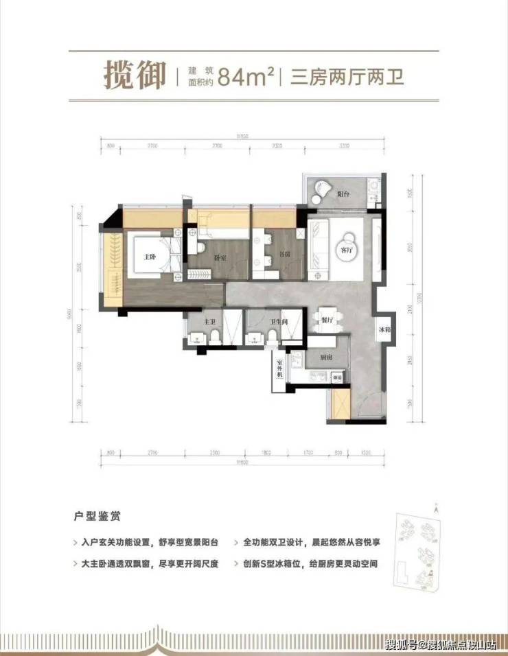 【建面约82㎡的三房两厅两卫】:竖厅三房,动静分区,S型冰箱位,阳台空间比较大,有差不多4.9个平方,主卧双飘窗,带独立卫生间;房间都很通透,采光也好,因为都带飘窗。