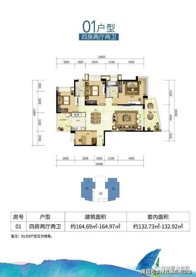 01(东户)/03(西户)户型互为镜像:164平米四房两卫(415-623万/套)