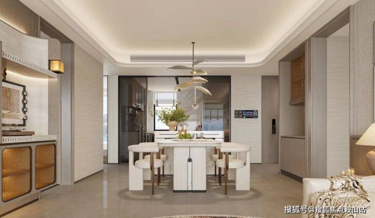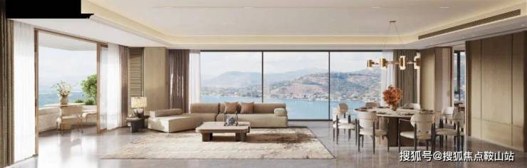 约 60.3㎡客餐厅 堪称豪宅核心气场,最重要的是,他 创新性做了 270°转角厅设计 ,直接释放 出 更长的采光面与观景面,足以媲美 200㎡户型。