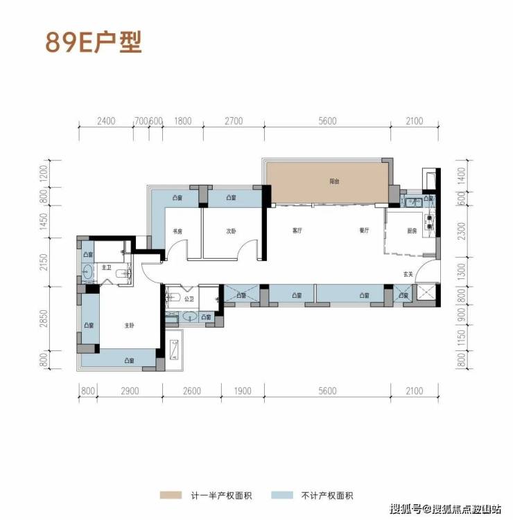 通透的横厅结构,客餐厨一体,全部打通开阔感会非常好。阳台宽度2m但是有5.6m长,要知道这是89m²的小户型都有这么长的阳台,非常难得。得房率约:96.4%(包含赠送),阳台主朝西北或东北向。