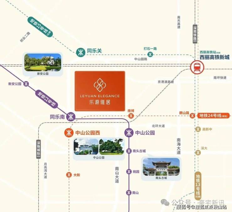 12号线同乐南站(直线约500m),1站中山公园,2站到西丽高铁站(在建中),4站到科技园,5站到前海;