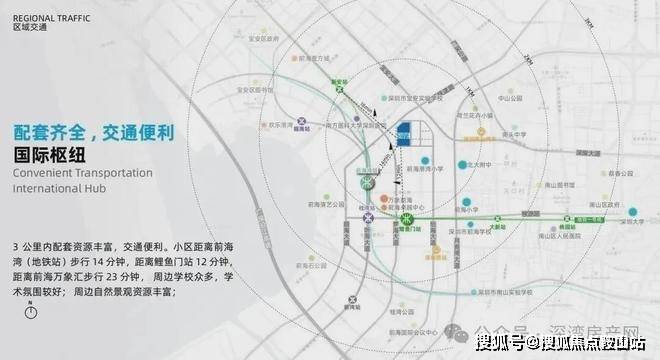 项目距离约1号线、5号线、11号线三线交汇的前海湾站约760米,约800米可到1号线新安站;未来依托在建的深铁前海国际枢纽中心,将汇聚地铁、城际、口岸等多种交通方式,实现南山福田及大湾区核心城市的快速通勤。