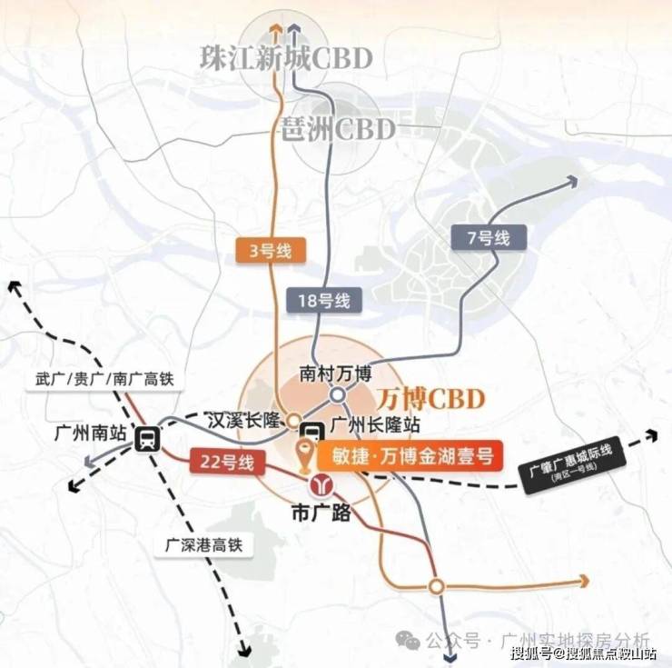 项目距离地铁22号线市广路站约800米,1站番禺广场、2站万博中心,3站琶洲CBD、4站珠江新城。目前22号线只开通了陈头岗到番禺广场的路段,乘坐22号线可一站到广州南,或者1站到番禺广场换乘3/18号线,去珠江新城或者琶洲都很方便。
