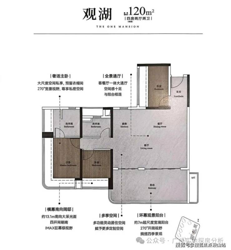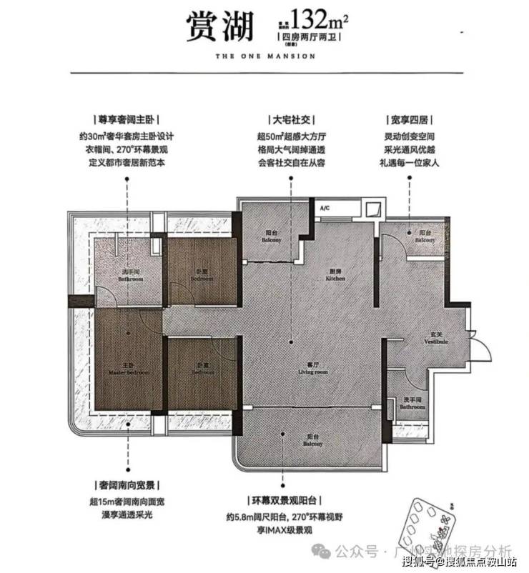建面132平四房两卫,横厅南北对流设计,超50平的大方厅,约5.8米的景观阳台,主卧面积也有30平,带独立衣帽间。