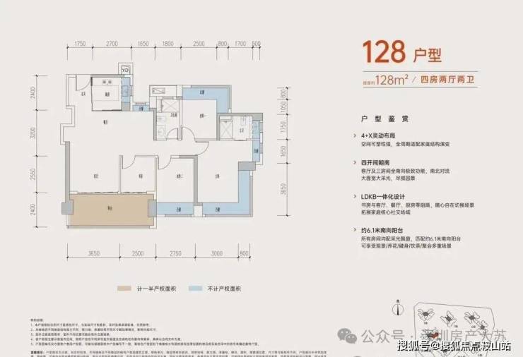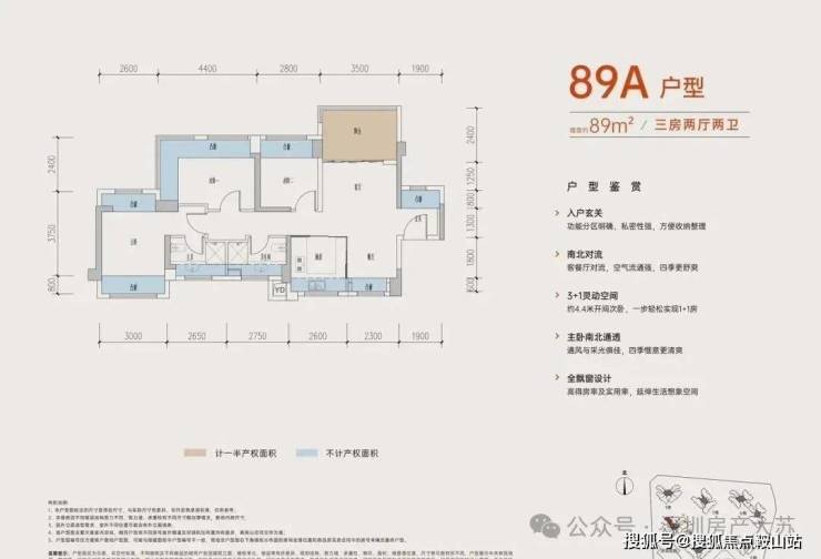 约89㎡横厅3房西南户型总价297-317万元,东南侧户型均价约为302-330万元;