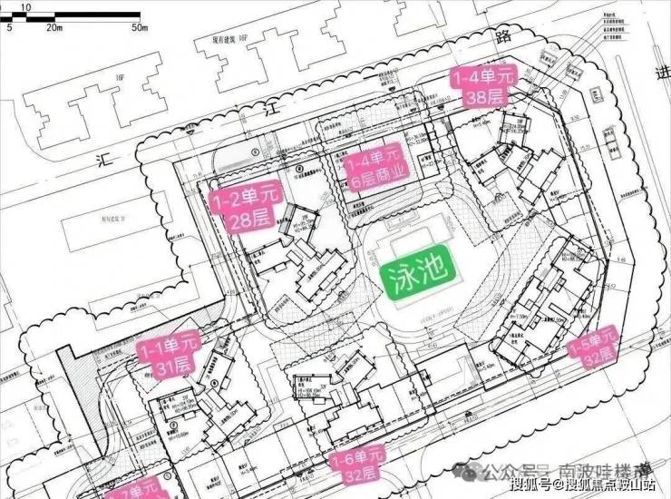 共规划建设7栋楼体,其中5栋为28-38层的高层住宅,共504户,均采用2梯4户或3梯4户的设计,另有1栋6层商业和1栋21层的办公产品,此外,小区内设有泳池配套。