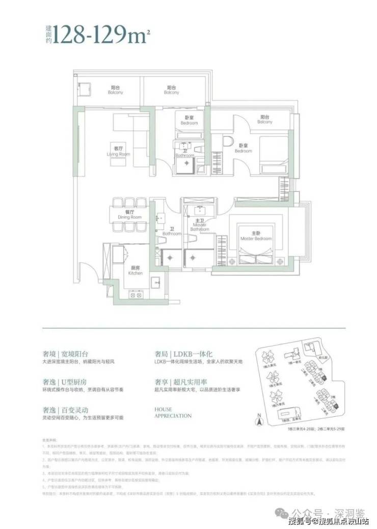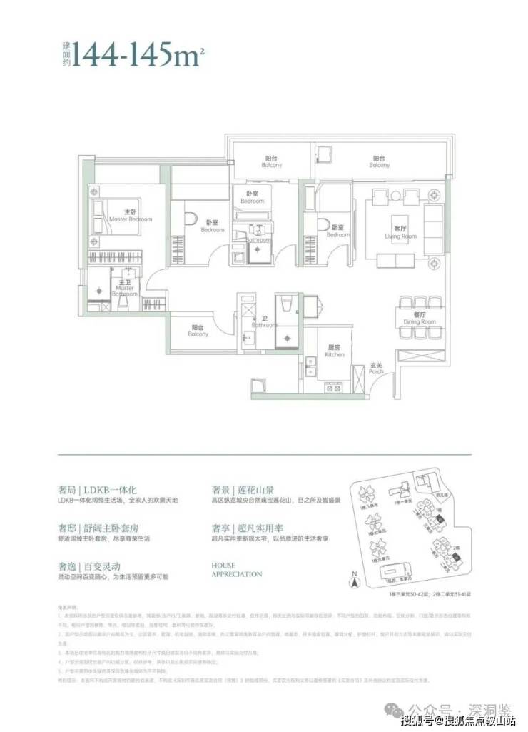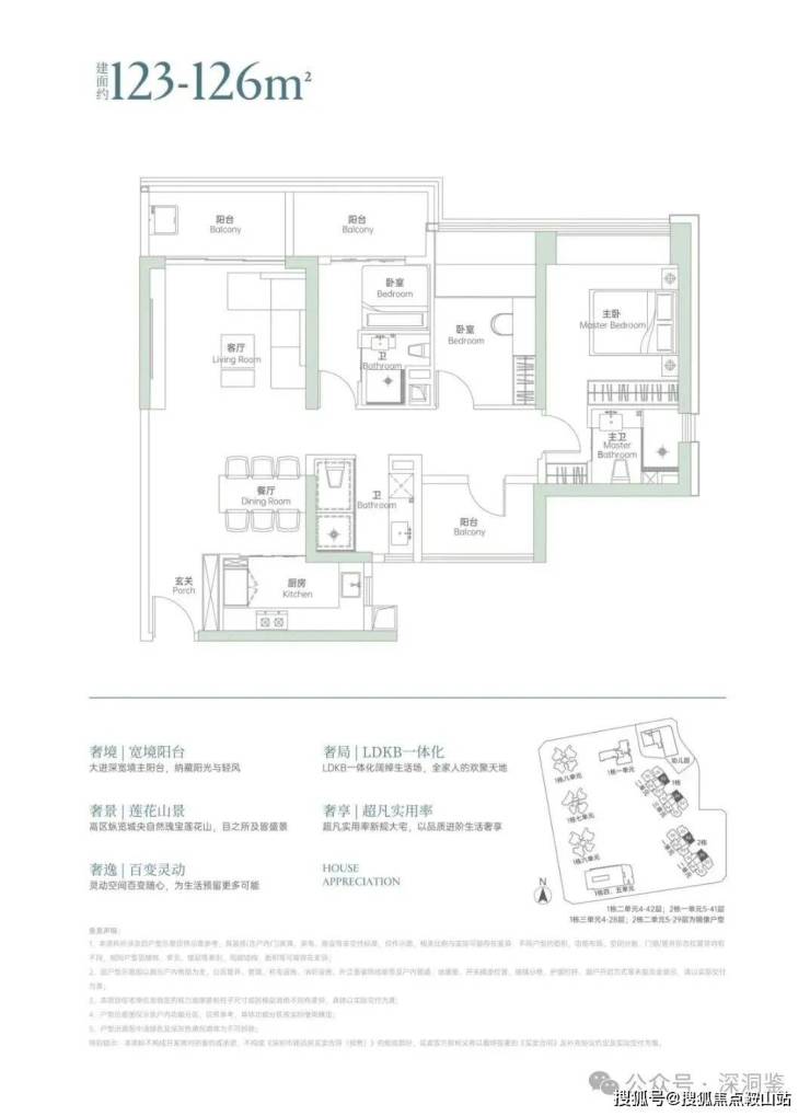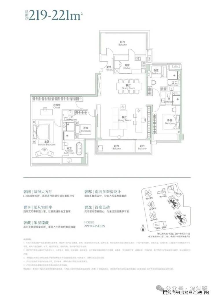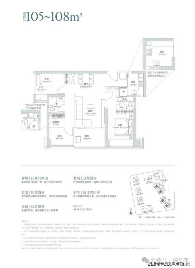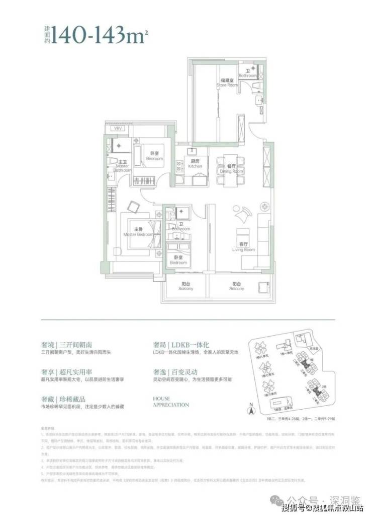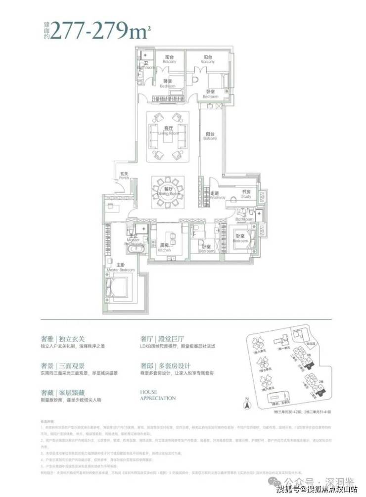 住宅面积最小105平,最大280平,包括105平三房,125-145平四房,190-220平五房,280平六房。