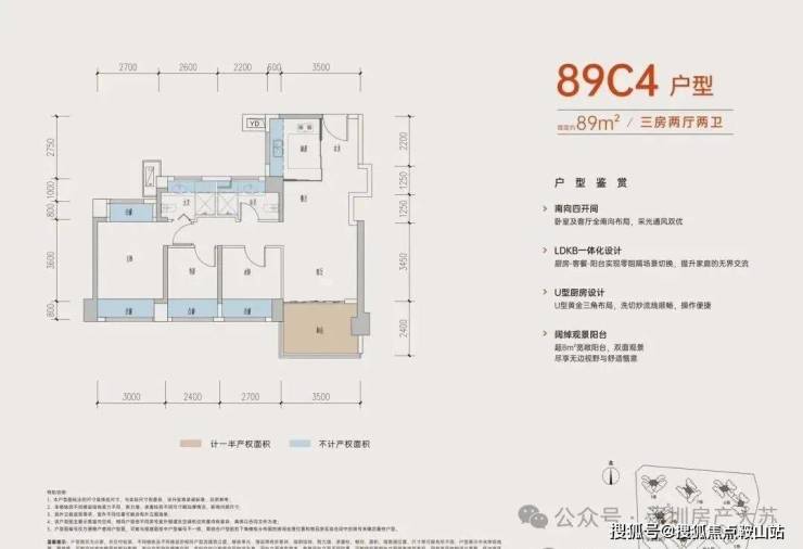 约89㎡横厅3房西南户型总价297-317万元,东南侧户型均价约为302-330万元;