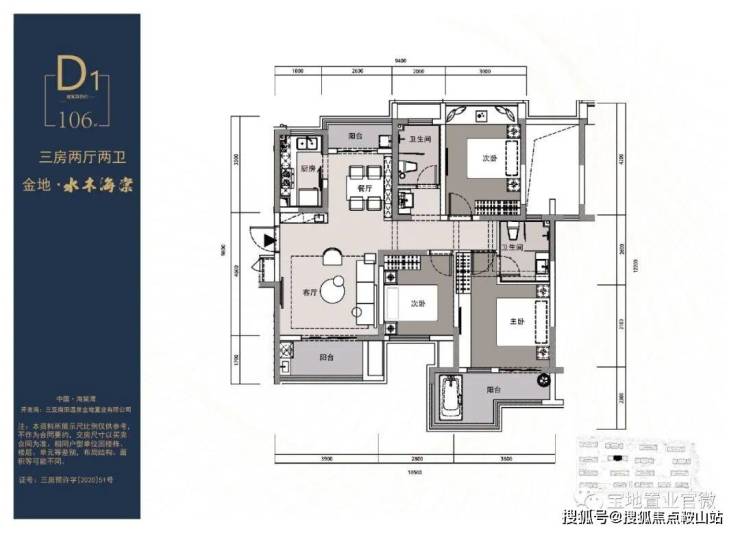 D1户型:建筑面积约106㎡;3房 2厅 1厨 2卫 大阳台 入户泡池纯板式 一梯两户 南北通透 精装拎包入住