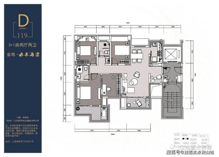 D户型:建筑面积约119㎡;3+1室 2厅 1厨 2卫 大阳台 入户泡池纯板式 一梯两户 南北通透 精装拎包入住
