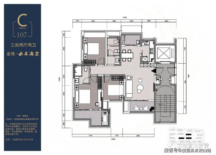 C户型:建筑面积约107㎡; 3室 2厅 1厨 2卫 大阳台 入户泡池纯板式 一梯两户 南北通透 精装拎包入住