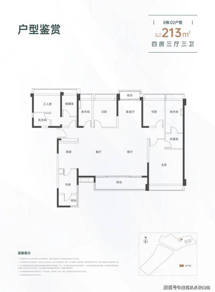 213㎡的4房3厅3卫,设计的是横厅南北通透格局,一梯一户,进门入户玄关,LDKB一体化设计,四开间朝南,双阳台通透,主卧大套间设计,还配有保姆独立套房,中西型多功能厨房,卫生间干湿分离,得房率约82%(不含赠送),阳台主朝东南向。