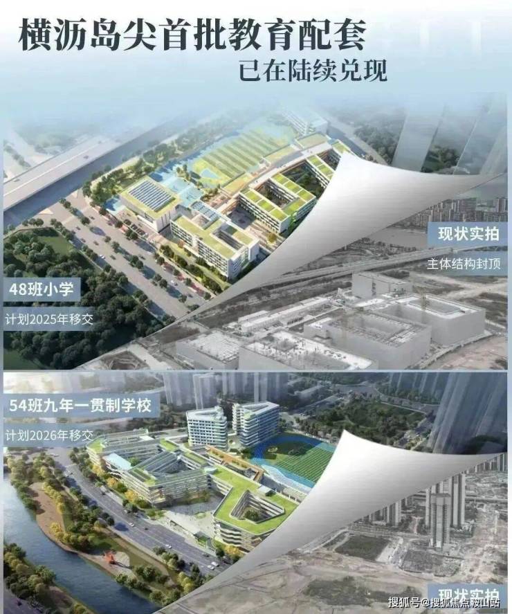 横沥岛上规划小学3所、九年制学校3所、十二年制学校1所,国际学校1所;其中,1所54班九年制学校(2026年投用)及1所48班小学(2025年投用)已获批建设。