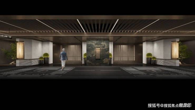 车库双大堂设计,大面积采用天然浅色石材,并于天然奢石加以点缀,光厅顶面采用金属构件,结合灯带,增加层次感,彰显项目高定品质。