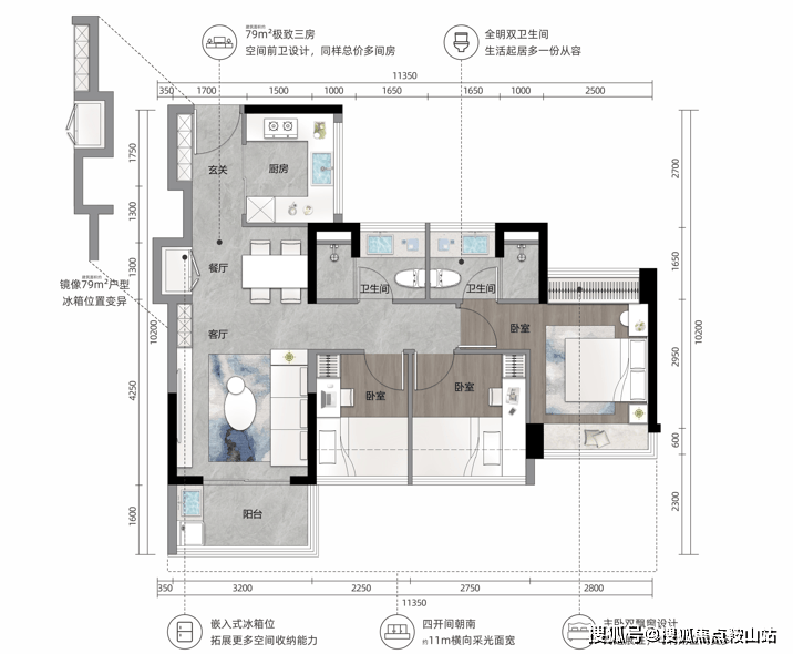 79m²三房顶配双明卫生间,四面宽朝南约11m采光面,送7个飘窗