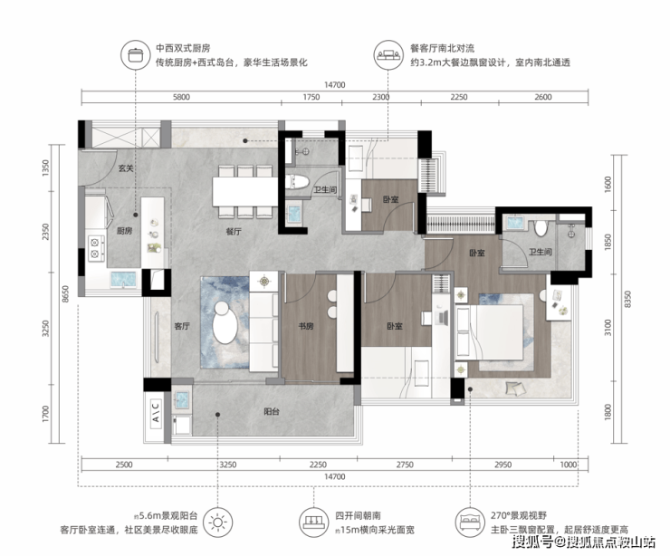 中式厨房配备西厨岛台,LDK一体化设计,约5.6m景观阳台,约12m四开间朝南,主卧三飘窗+270°景观面,豪宅因素一个都不少