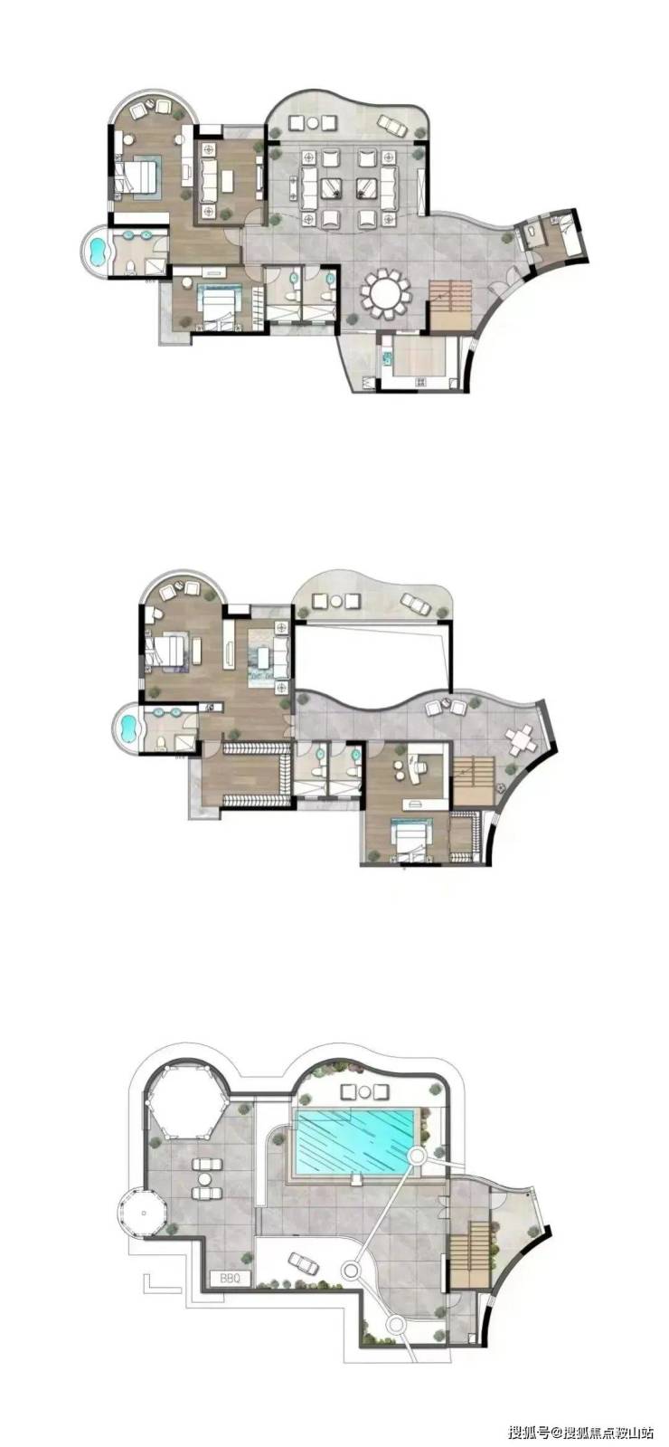 再细看,约458平、467平、564平顶复户型图参考如下,为双层结构,且赠送多一层露天泳池花园,相当于有3层使用空间。