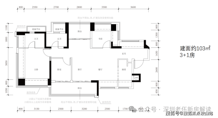 这个户型位于端头位置,独门独户,还在户型外围做了一圈不计面积的飘窗、设备平台,综合使用率最高约103%。