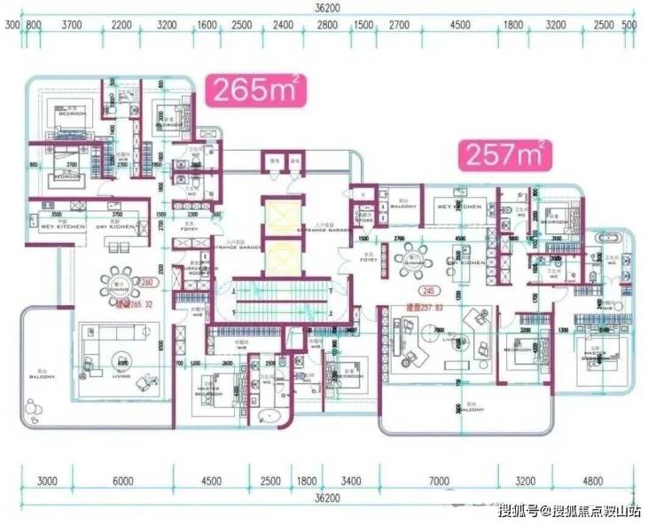 253–332㎡家族平层:2T2板楼设计,独立入户,双主卧套房均带海景卫浴,视野无遮挡,定位为顶奢客群。