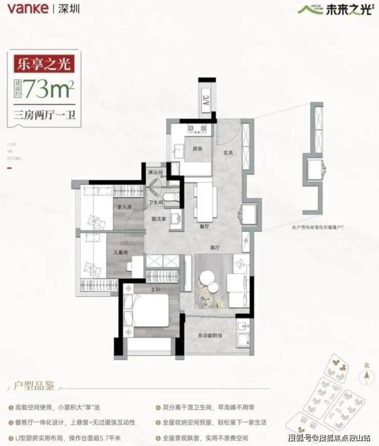 产品方面,项目主推建面约73-125平方米的3至4房,涵盖73-80㎡三房一卫、98㎡三房两卫及125㎡四房两卫,所有户型均精装交付-4-9。作为深圳建筑新规后的产品,户型设计以高使用率为核心亮点——73㎡户型做到三房一卫,双分离干湿卫生间、U型厨房布局、全屋景观飘窗,空间利用率极高;80㎡户型更实现三房两厅两卫,在深圳新房市场中极为稀缺-9。价格方面,项目毛坯限均价约8.74万元/㎡,当前在售均价约6.6万-8.5万元/㎡,三房户型总价约548万元起,对比尖岗山片区其他在售项目(如凤鸣水岸花园约7.8万元/㎡、阅臻府约8.6万元/㎡)形成了显著的价格优势-2-5-9。