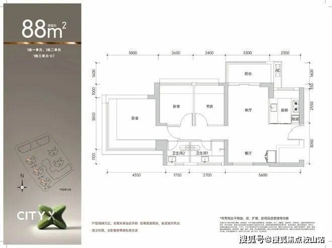 88㎡的3房2厅2卫,设计的是竖厅南北通透格局,客厅3.3米开间,LDKB一体化设计,四开间朝南,主卧270°无转角飘窗,3个卧室分别做到了主卧15.63㎡/次卧7.54㎡/次卧6.96㎡(包含墙体飘窗),U型厨房,卫生间干湿分离,得房率约90%(包含赠送),阳台主朝西北或东北向。✨✨鸿荣源观城售楼处电话:400-859-7606【售楼处已认证】✨✽✽✽✽