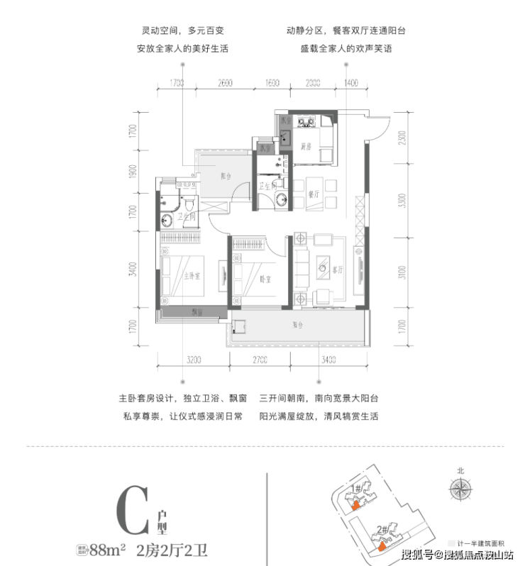 建面约88㎡2+1房