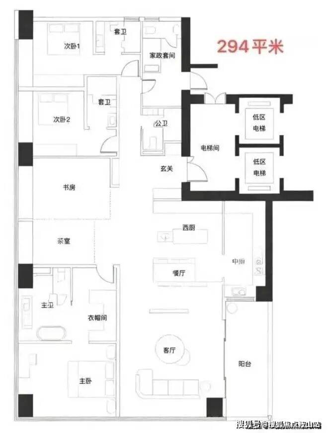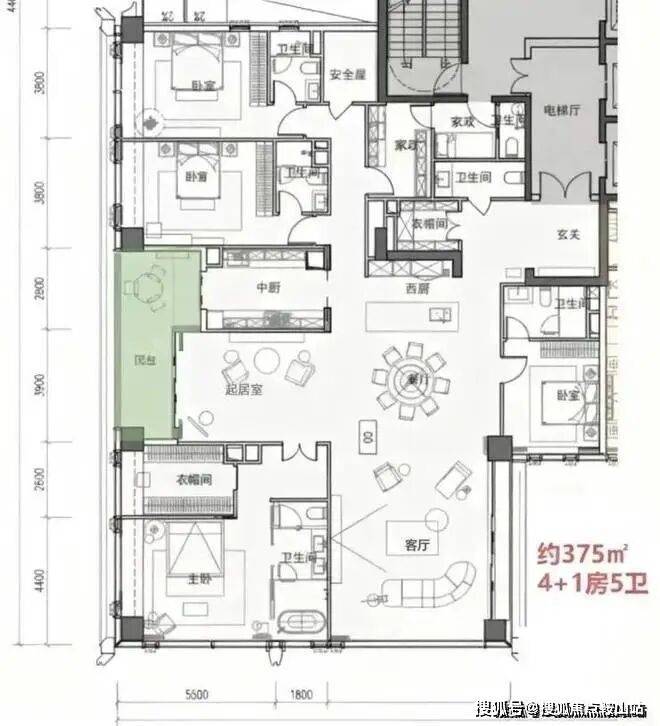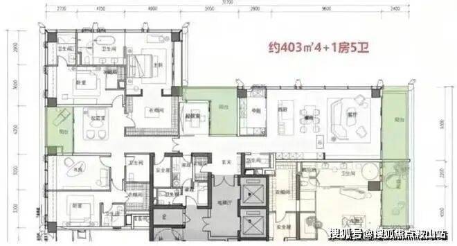 空间配置:4+1房五卫,家庭厅+家政套间,独立电梯厅入户