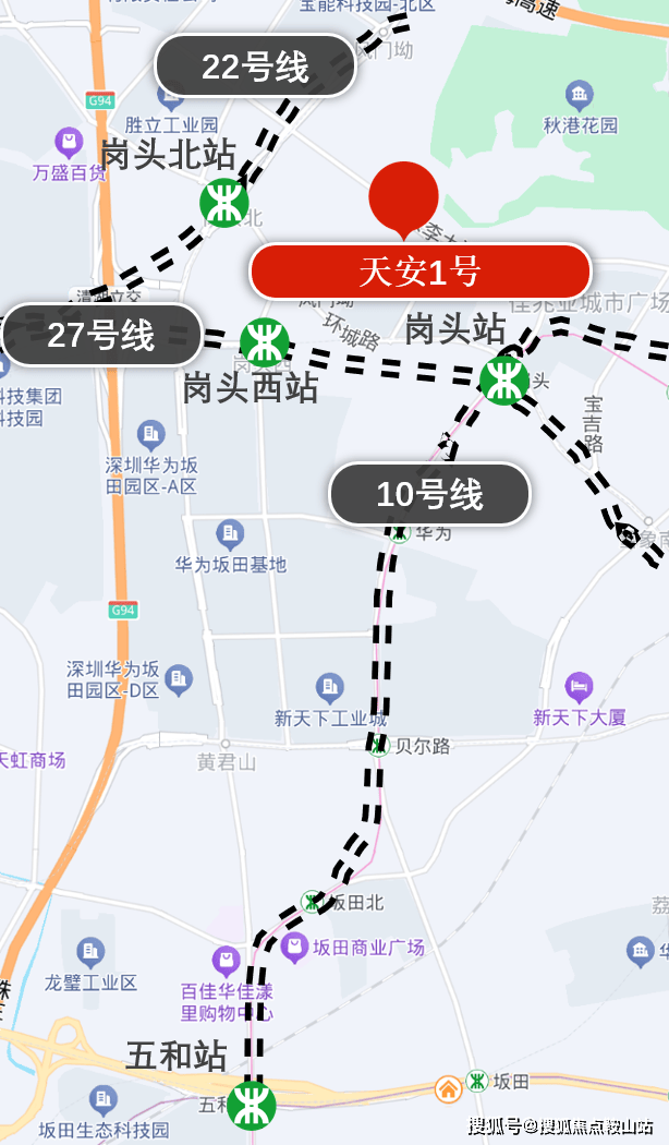 天安1号位于龙岗区坂田街道天安云谷产业园三期,属于天安岗头旧改的其中一部分,北侧一路之隔是秋叶湖、华为金园公寓,距离10号线岗头站步行约700米左右,距离在建的地铁22号线岗头北站和27号线岗头西站步行约1100米左右。