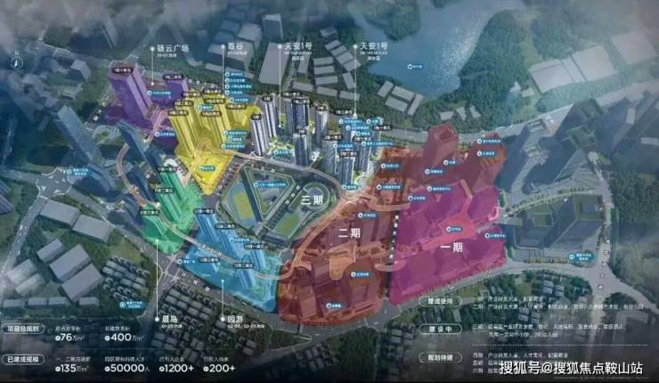 商业配套:天安1号自带约2.3万㎡商业,与一、二期联动形成近10万㎡商业集群。一、二期已引入华为旗舰店、海底捞、星巴克、奈雪等200+家知名品牌,1-3期总计约20万㎡,定位高端,规划有"云街"概念商业主线,结合科技主题与社区便利服务。