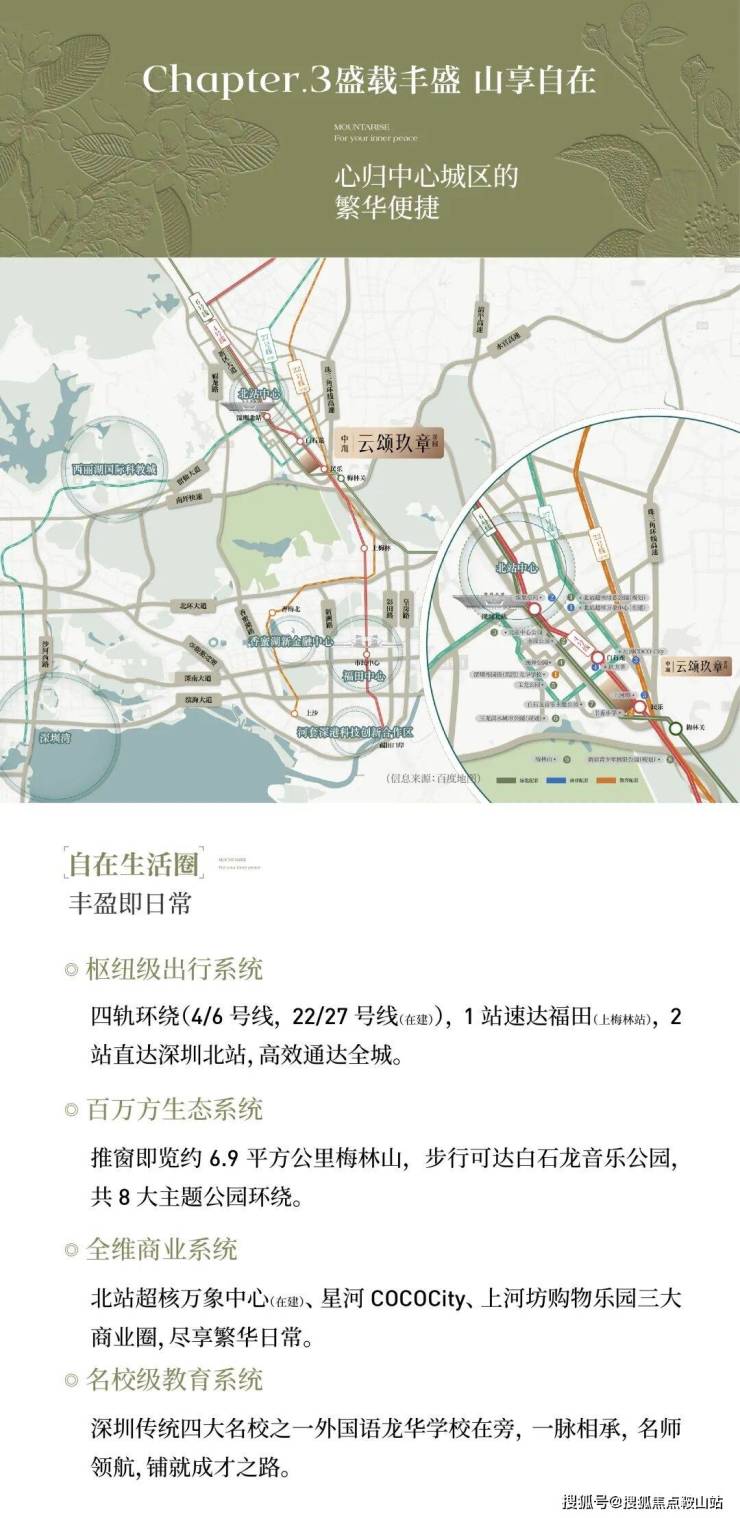 而中海云颂玖章的升级,不止于室内。项目步行500米即达4/6号线双地铁口,1站直达福田,2站到深圳北站,真正实现离尘不离城——背靠梅林山的自然静谧,转身即享福田CBD的繁华配套,不用在“住得舒服”和“上班通勤”之间做取舍。