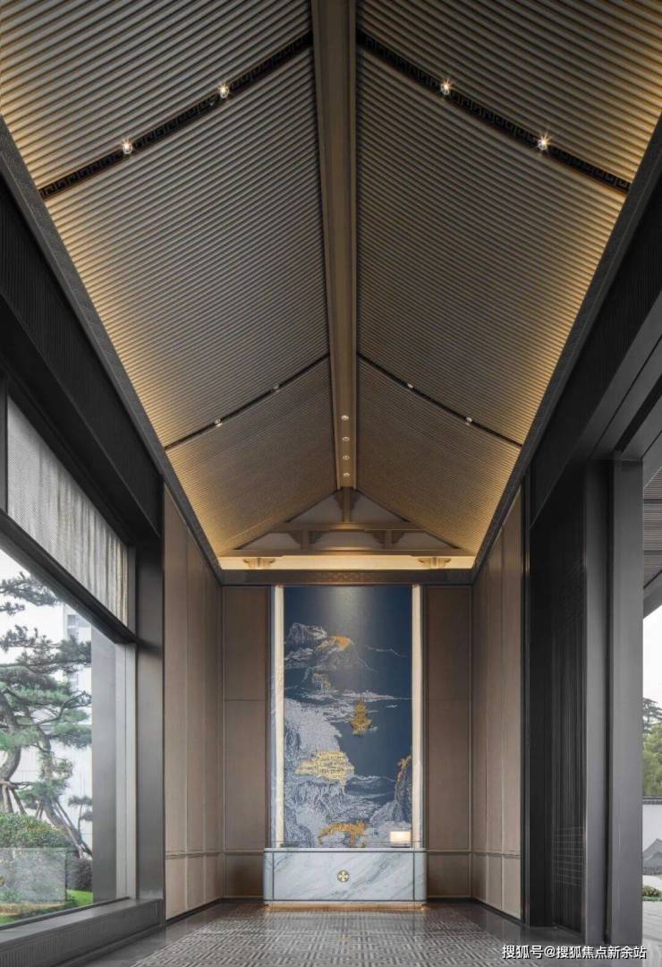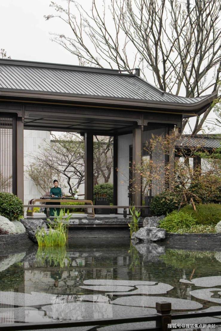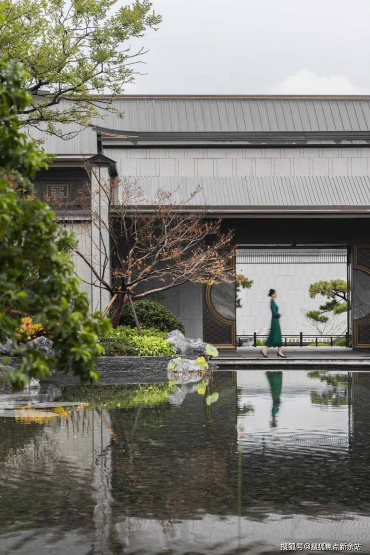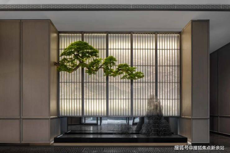 栅格屏影,雾隐楼台,洗光渲染氤氲基调;松枝苍劲屈曲,龙鳞斑驳,青针叠簇渐起自然主旋;现代设计的体块、结构,在消解中寻译,兴于水而归无形,萦绕律动韵角……