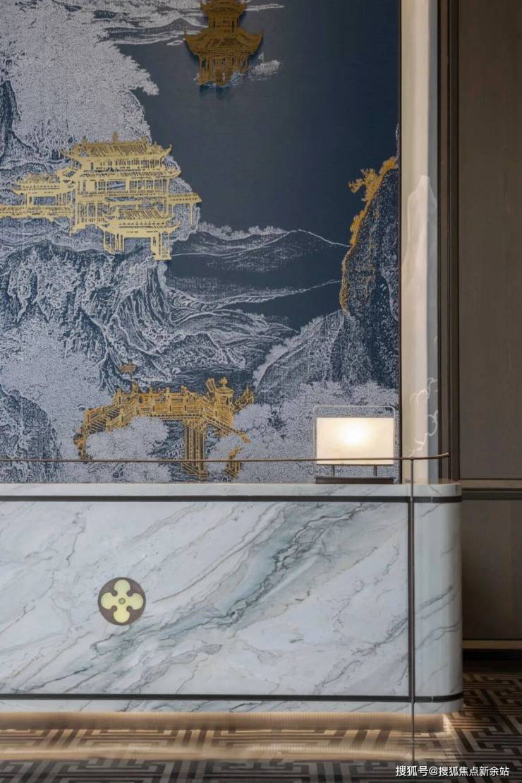 蓝底色雅,白描山水,勾金衬显楼阁飞桥,铺叙层次;庑殿尖顶,木椽秩排,承中式构筑而衍东方真意,蓄势生韵。