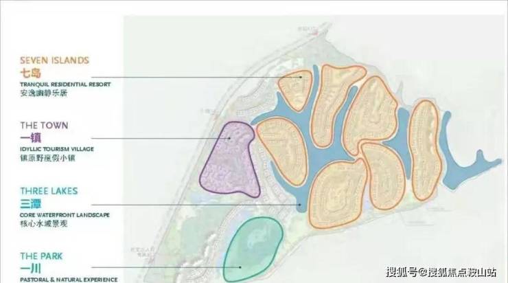“七岛、一镇、三潭、一川”,涵盖安逸幽静乐居、镇原野度假小镇、核心水域景观、田园山野体验,度假住宅区根据主题定位,分为七个组团,对应北斗七星,分别以北斗七星中的七颗星的名字来名各组团,并通过硬景铺装、金属涂料、导视标识等运用颜色以组团特色,加强组团主题