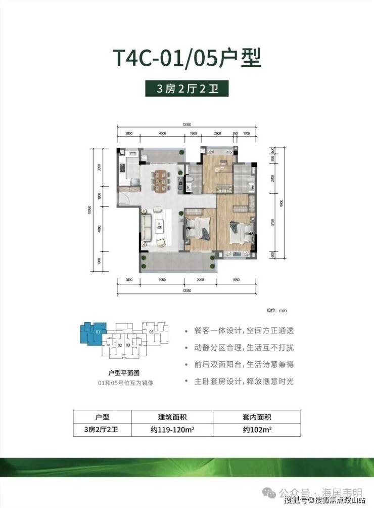 一梯四户:120平,通透边户三房。