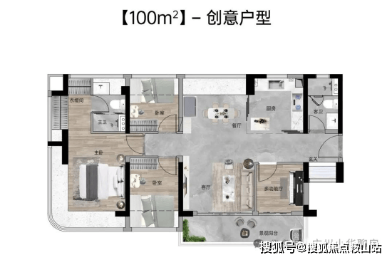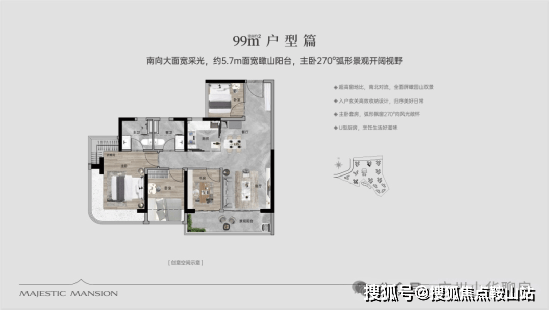 【96㎡四房两厅两卫】:西南向,使用率100%,约5.7米面宽瞰山阳台,主卧270°主卧弧形玻璃幕窗。