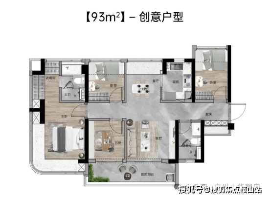 【93㎡四房两厅两卫】:东南向,使用率109%,独立入户玄关,南北通透,四面宽极致视野,主卧270°主卧弧形玻璃幕窗。