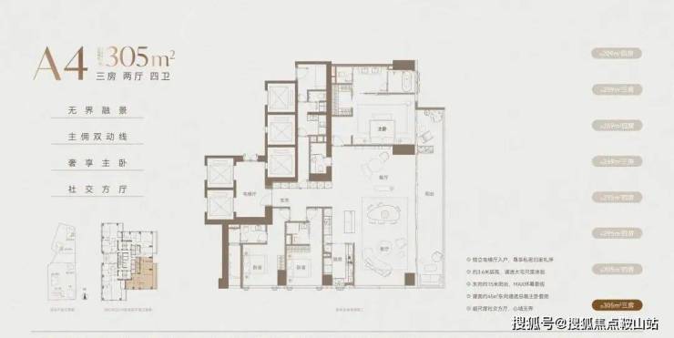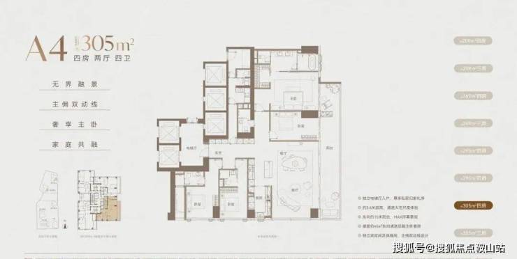 无 9070 政策限制,纯大户型社区,规划 209-1180㎡全段大平层,209-305㎡主力户型均有两种设计方案可选,可兼顾房间数和客餐厅舒适度,精装还能定制,厨电系统也支持深度改造;