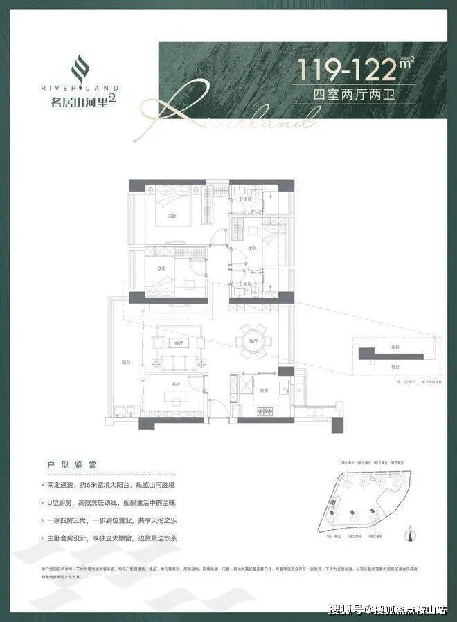 119-122㎡的4房2厅2卫,设计的是竖厅南北通透格局,客厅3.8米开间,四开间朝南,全屋飘窗,U型厨房,得房率:74.83%(不含赠送),阳台1.5米进深,6米长超大阳台,主朝西南向。