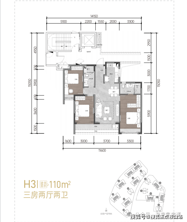100㎡:二房二厅两卫只有4户