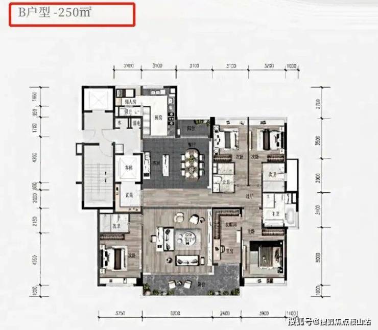 320㎡的五房的户型更奢侈了,竟然有2条主要过道!衣帽间大得离谱,能泡澡的主卫,还能欣赏到南向的自然山体!