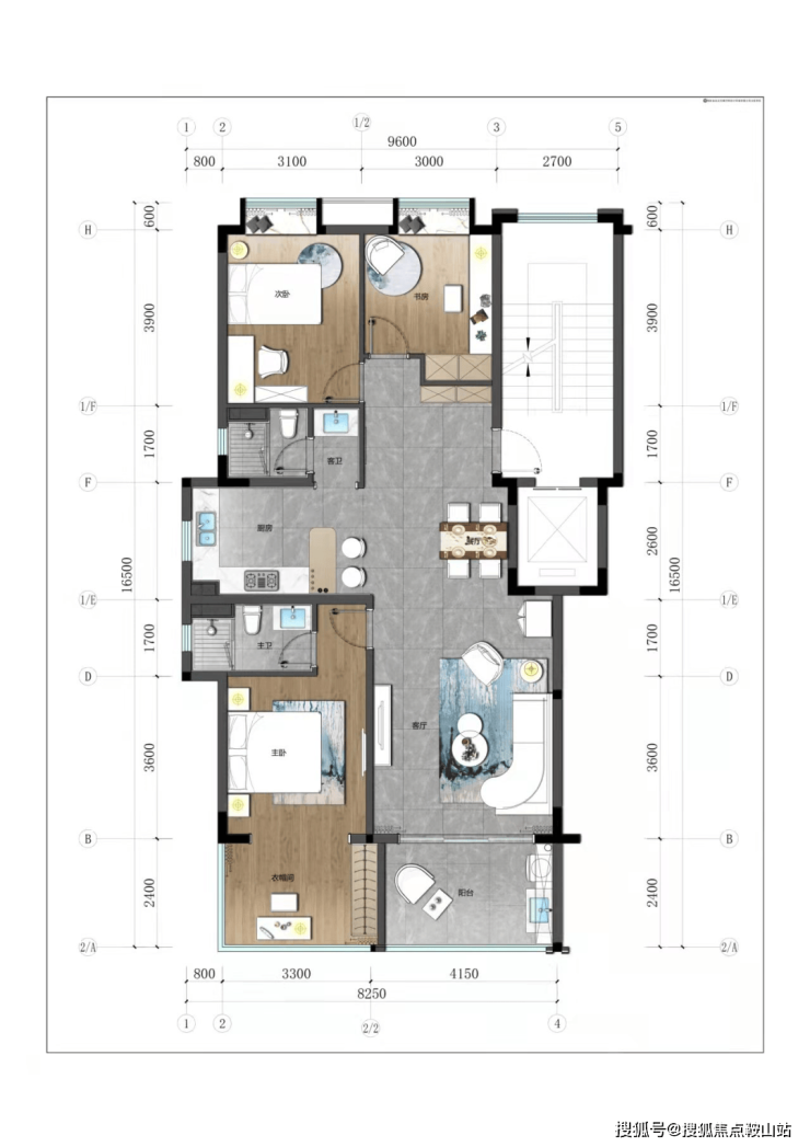 2.上叠:建筑面积约120㎡,四房两厅三卫。